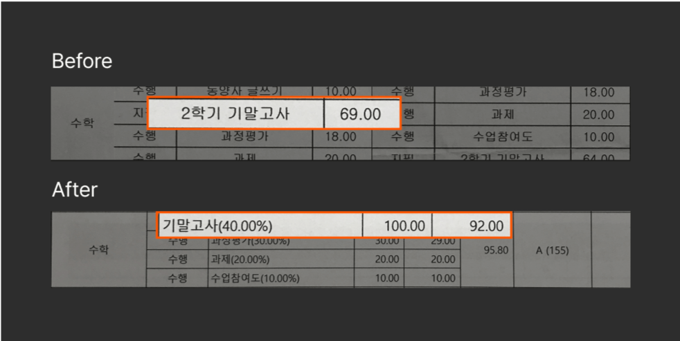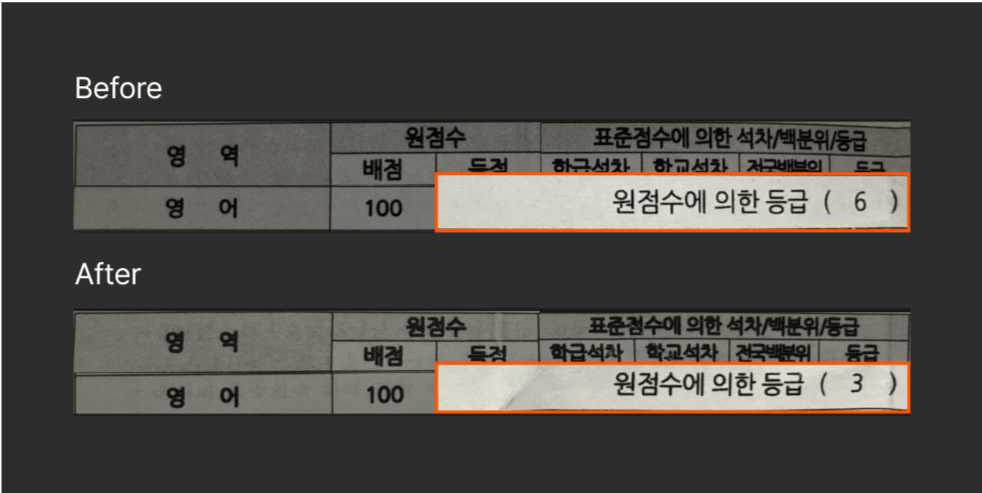 영어가 6등급에 가까운 5등급이었는데, 3등급에 가까운 4등급으로 올랐고 수학은 7등급에 가까운 6등급이었는데 4등급에 가까운 5등급이 되었어요! 저에게 맞춰 선생님이 매칭되고 커리큘럼도 저에게 맞춰서 따라가기 편했어요!